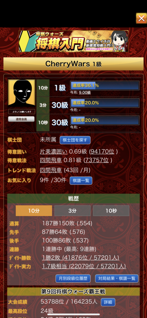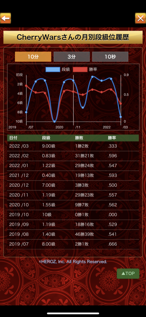 1月は長期出張だったので調子が下がってましたが、少し盛り返しました。それにしても歳のせいかなかなか上達しません。しかし、青い線をよく見ると少しずつですが、上がっているので、この調子で頑張ればいつかは初段になれるかも。