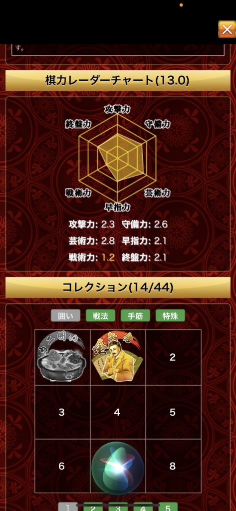 棋力レーダーを見ると戦術力が極端に低いです。反対に芸術力が高くなっています。他の人の分析によると、定石の勉強が足りずに行き当たりバッタリで差しているとこういう傾向になるのだとか…